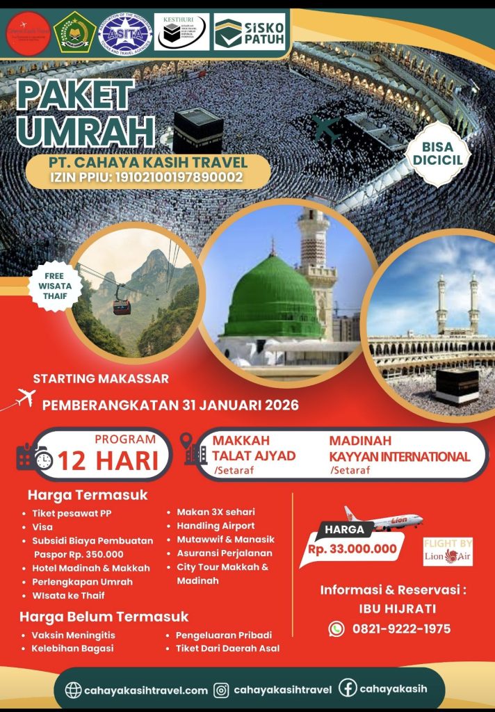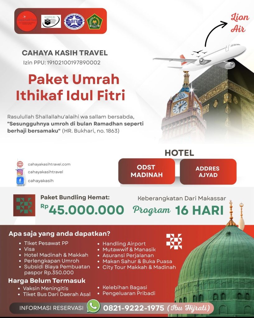 Paket umrah di bulan Maret 2026 dengan program 12 hari perjalanan. Maskapai menggunakan Lion Air.